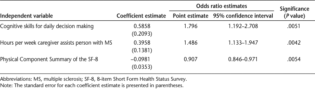 We utilized the stepwise selection procedure to reduce the number of independent variables in the initial regression model, eliminating the least significant variables. Stepwise selection has the advantage of producing a small, readily interpretable model, containing the most important predictor variables.16 Stepwise selection methods are among the most widely used in medical applications.17 The stepwise selection method excluded 19 independent variables from our initial regression model. Table 4 presents the three characteristics of the caregivers, caregiving, and the person with MS receiving assistance that were significantly associated with caregiver employment at the level of α = .05.