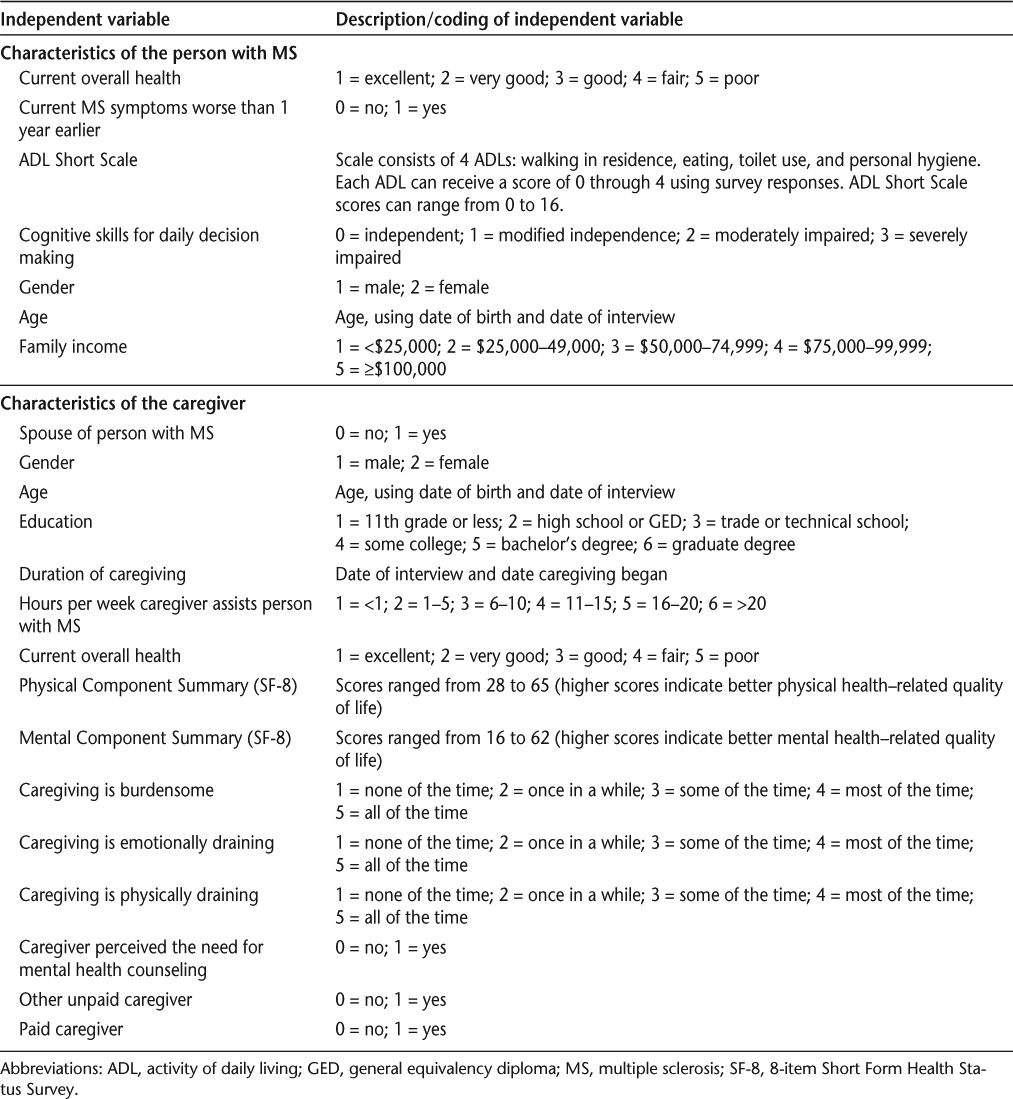 Of the 530 caregivers in our survey, 31.5% of caregivers were employed full time and 10.6% were employed part time at the time of the interview. Interviewers asked these 223 employed caregivers if providing assistance to the person with MS caused them to reduce the amount of time worked in the last 12 months, with 42% responding that they had reduced their employment. Because the study utilized a dichotomous dependent variable (a reduction in caregiver employment, coded as 0 = no; 1 = yes), we developed a logistic regression model. The initial regression model included 22 independent variables developed from survey response data. Of the 223 caregivers reporting employment, 215 caregivers provided data for all 22 independent variables and were included in the analyses. Table 1 presents these independent variables and describes how they were coded.
