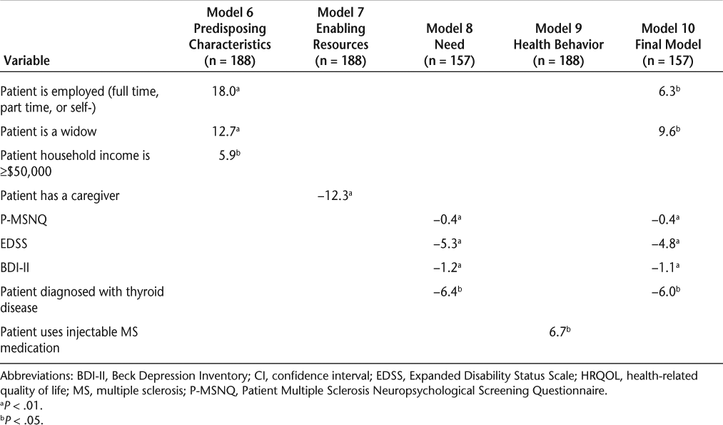 Table 3 presents the multivariate associations between the Predisposing Characteristics, Enabling Resources, Need, and Health Behavior variables as well as the final combined model and patient physical HRQOL (MSQOL-54 physical health composite score). The following variables were significantly associated with a decreased physical HRQOL in the final model: risk of neuropsychological impairment (P-MSNQ score) (Need), disability status (EDSS score) (Need), level of depression (BDI-II score) (Need), and presence of a comorbid condition (diagnosed by a health-care provider with thyroid disease) (Need). On the other hand, the following variables were found to be significantly associated with increased physical HRQOL in the final model: employment status (employed) and marital status (widowed) (Predisposing Characteristics).