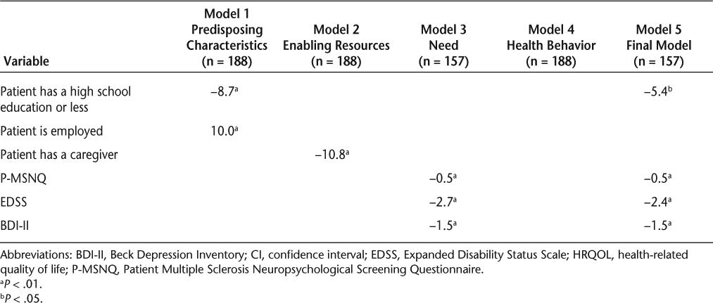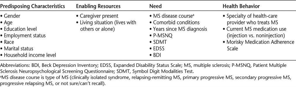 Methods: Data were collected at four MS centers on Long Island, New York, from a total of 211 patients. Three surveys were administered that collected demographic information and included validated questionnaires measuring quality of life (QOL), cognition, depression, and disability. Multivariate linear regression analyses examined the relationship between patient demographics and scores on standardized scales measuring mental and physical HRQOL (Multiple Sclerosis Quality of Life–54). Variables included in the regression models were selected on the basis of the Andersen Healthcare Utilization model. This framework encompasses the multiple influences on health status, including predisposing characteristics, enabling resources, need, and health behavior.