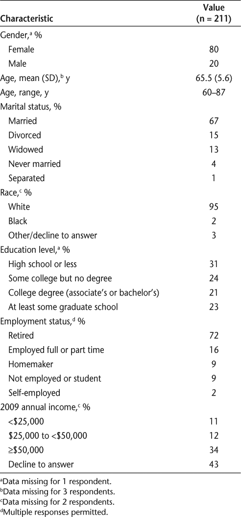 Respondent demographics were self-reported and are displayed in Table 4. On average, respondents were 65.5 (SD 5.6) years old. The majority were female (80%), and nearly all were white (95%). Two-thirds were married (67%), one-eighth were widowed (13%), and nearly three-quarters were retired (72%). Respondents were more likely to be currently living with their spouse (65%) than alone (18%) or with their children (17%).