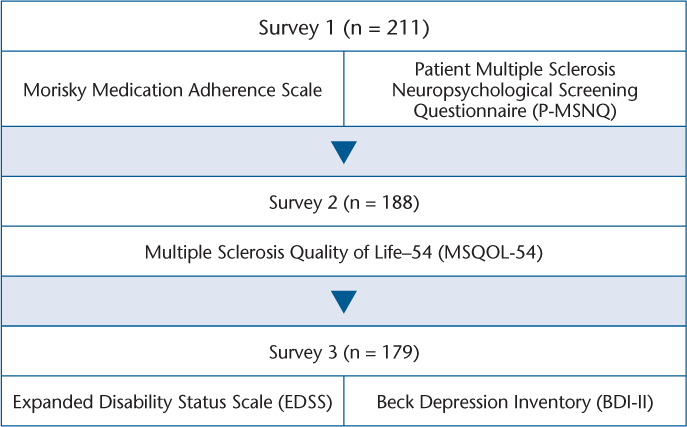 The measures included in each survey as well as the number of completed interviews for each one are shown in Figure 1. The first survey included demographic questions, the Morisky Medication Adherence Scale, and the Patient Multiple Sclerosis Neuropsychological Screening Questionnaire (P-MSNQ). The second survey included the Multiple Sclerosis Quality of Life–54 (MSQOL-54), and the final survey included the Beck Depression Inventory (BDI-II) and the self-reported Expanded Disability Status Scale (EDSS).