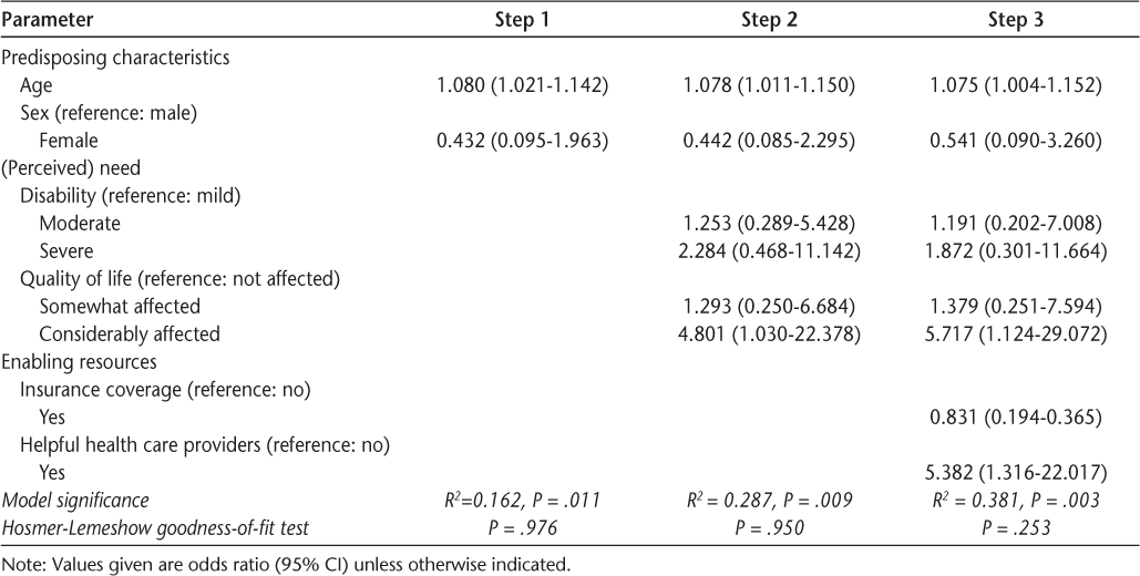 We conducted hierarchical multivariate logistic regression analysis. The model included three steps, each with two variables: step 1, predisposing characteristics (age and sex); step 2, perceived need (self-reported disability and QOL); and step 3, enabling resources (insurance coverage and presence of helpful health care providers). All the analyses were performed using available data and IBM SPSS Statistics for Windows, version 21.0 (IBM Corp, Armonk, NY).