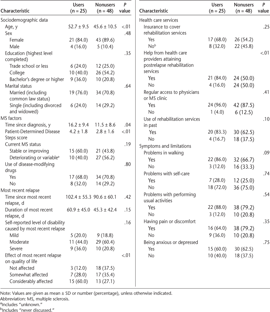 Characteristics of the 73 participants who recently had an MS relapse, grouped by postrelapse rehabilitation services use status