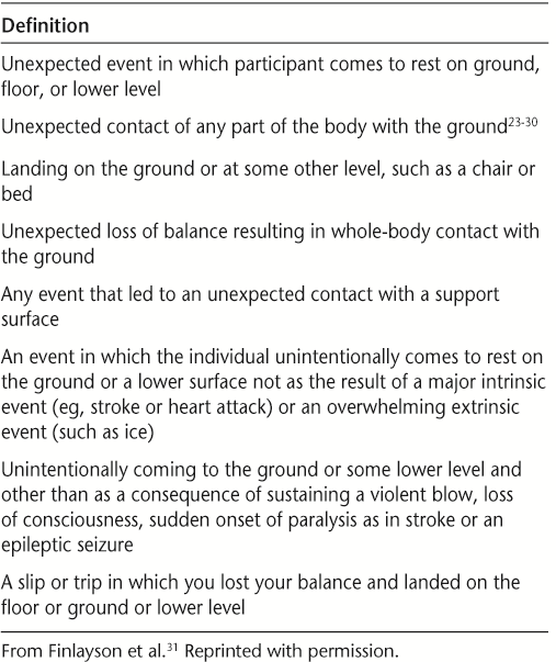 In the MS literature to date, a number of definitions of a fall have been used, and these are presented in Table 2.23–31 In a systematic review of the literature on falls in older people, Hauer et al.32 found that the lack of definition in some studies and the range of definitions in others precluded comparison between studies. This review led to the definition proposed by ProFaNE,10 which recommends that a fall be defined as “an unexpected event in which the participants come to rest on the ground, floor, or lower level.” This definition has been used verbatim by several MS studies to date, and variations of it by others. The advantage of this definition is that it is straightforward and minimizes subjective judgment by the researcher and/or participants. Consequently, the IMSFPRN proposes to adopt this definition.