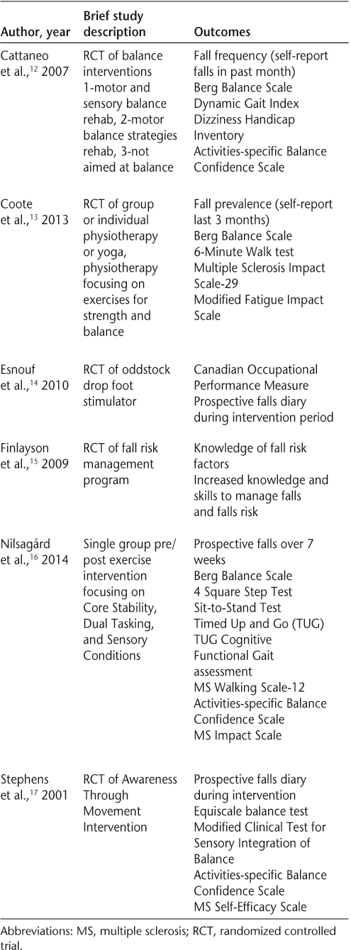 To date, a limited number of falls-prevention and fall risk reduction programs for people with MS have been investigated (Table 1).12–17 Owing in part to the varied nature of investigations, several different fall-related outcomes have been used. These include balance, dynamic mobility, balance confidence, adoption of falls-prevention strategies, composite measures of fall risk (ie, physiological profile assessment [PPA] of fall risk), retrospective recall of falls, and prospective falls diaries. The outcome measures used have a range of strengths and weaknesses. For example, the adoption by people with MS of falls-prevention strategies is a potentially positive outcome, and interventions have been shown to improve relevant knowledge and skills among people with MS.15 However, people who use fall risk reduction strategies still fall frequently,18 suggesting that the adoption of fall risk reduction strategies should not be the sole outcome for falls-prevention studies.