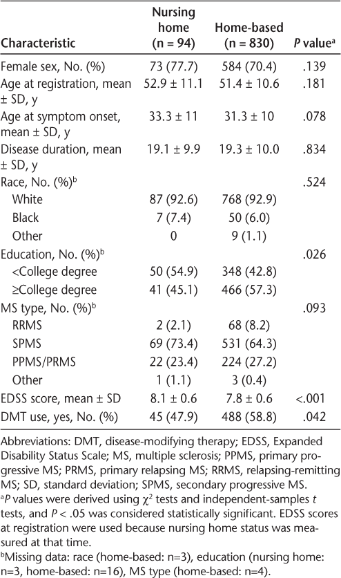 Of the 924 participants, 94 (10.2%) lived in a nursing home and 830 (89.8%) lived in a home-based care setting. There were no significant differences in sex, race, age at MS onset, or MS type between the groups (Table 1). There was a significant difference in educational levels (P = .026): nursing home patients were more likely to report less than a college level of education (54.9%) compared with patients receiving home-based care (42.8%, P = .026). The nursing home patients were also less likely to use a DMT compared with home-based patients (47.9% vs. 58.8%, P = .042). Furthermore, there was a significant difference in mean (SD) EDSS scores between the two groups (8.1 [0.6] for nursing home residents, 7.8 [0.6] for home-based patients, P < .001). These results are presented in Table 1.
