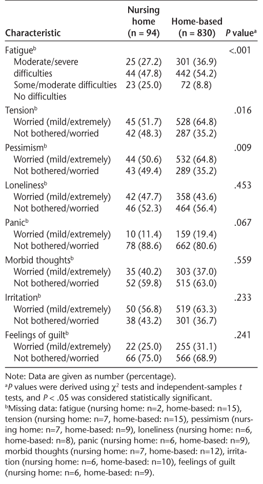 Nursing home patients reported moderate/severe levels of fatigue in 27.2% of the cases; this was significantly higher in patients receiving home-based care (36.9%, P < .001). Furthermore, just 51.7% of patients in the nursing home group reported feeling tense compared with 64.8% of patients receiving home-based care (P = .016). Similarly, 50.6% of patients in the nursing home group reported feelings of pessimism compared with 64.8% of patients in the home-based group (P = .009). There were no significant differences between the nursing home and home-based care groups for any of the other mood state variables, such as loneliness, feelings of panic, morbid thoughts, irritation, and feelings of guilt. These results are presented in Table 2.