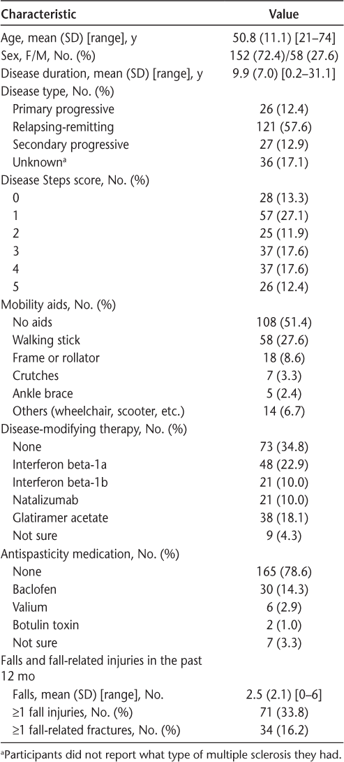 The mean (SD) age of participants was 50.8 (11.1) years, and 152 were women (72.4%). Table 1 shows the demographic and MS-specific disease characteristics of the sample.