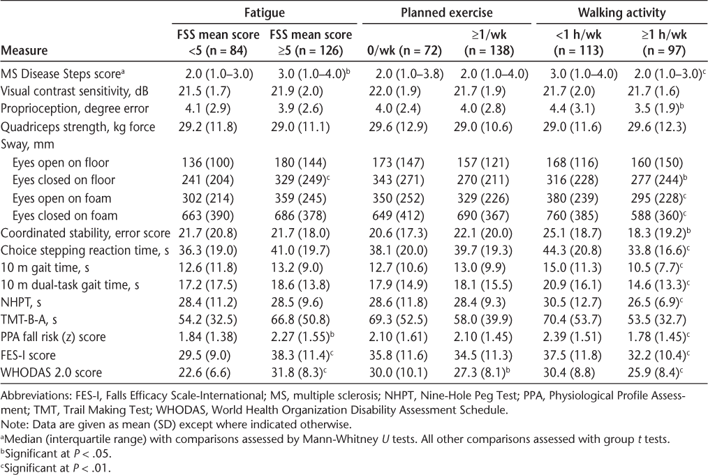 Test scores for sensorimotor, balance, gait, neuropsychological function, and quality of life measures for participants categorized as having low or high fatigue, 0 or 1 or more planned exercise per week, and less than 1 or 1 or more hours of walking activity per week