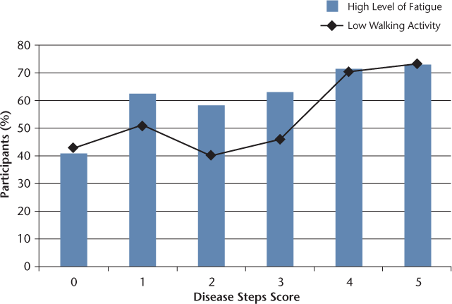 Combined bar and line graph of high levels of fatigue and low walking activity according to Disease Steps score