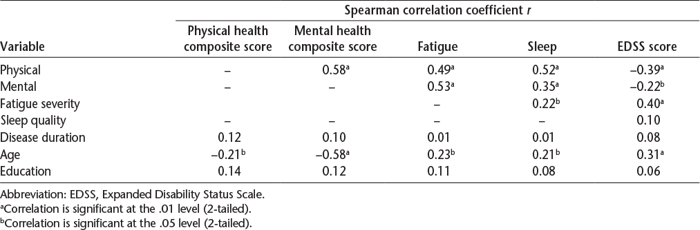 Similarly, there was a high positive correlation between EDSS score and fatigue (r = 0.40, P < .01) and a weaker but statistically significant negative correlation with the QOL mental and physical composite scores (r = −0.22, P < .01 and r = −0.39, P < .01, respectively). Age was negatively correlated with the QOL physical (r = −0.21, P < .05) and mental (r = −0.58, P < .01) composite scores and was significantly correlated with fatigue (r = 0.23, P < .05) and sleep quality (r = 0.21, P < .05). There was no significant correlation between the QOL composite scores and education or disease duration.
