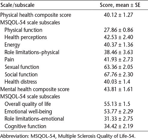 Results: The mean ± SD age of the 217 patients was 32.6 ± 8.6 years, and 79% were female. One hundred fifty-two patients (70.0%) were classified as poor sleepers based on PSQI scores; 122 (56.2%) had significant fatigue based on FSS results. The mean ± SE physical (PCS) and mental (MCS) health composite scores of the MSQOL-54 were 40.12 ± 1.27 and 43.81 ± 1.61, respectively. There was a strong statistically significant positive correlation between PCS scores and MCS (r = 0.58), FSS (r = 0.49), and PSQI (r = 0.52) scores. MCS scores were strongly correlated with FSS (r = 0.53) and PSQI (r = 0.35) scores. Age exhibited statistically significant negative correlations with PCS (r = −0.21) and MCS (r = −0.58) scores, and was statistically significantly correlated with FSS (r = 0.23) and PSQI (r = 0.21) scores. Expanded Disability Status Scale scores were strongly correlated with FSS scores.