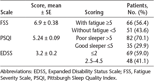 Table 1 shows the mean ± SE PSQI global, EDSS, and FSS scores in patients. The mean ± SE PSQI score of the patient sample was 5.24 ± 0.09. Reduced sleep quality (PSQI score >5) was found in 82 patients (70.1%). The mean ± SE (FSS) score of the patient sample was 6.9 ± 0.38. We classified 51 patients (43.6%) as not having fatigue and 66 (56.4%) as having fatigue. Sixty-nine patients (59.0%) had EDSS scores of 2 or less, and the remaining 48 patients (41.0%) had EDSS scores of 2.5 to 4.5.