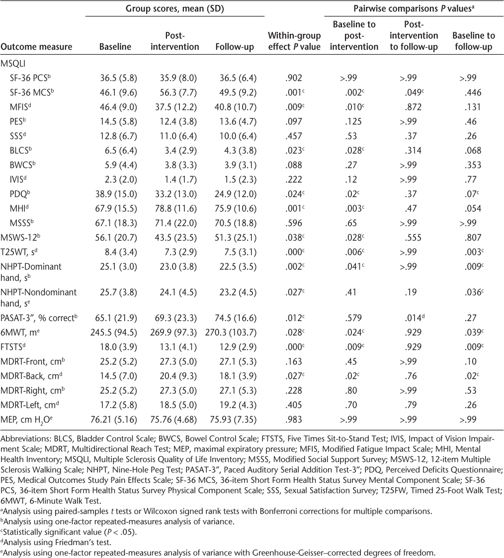 Data were analyzed using a statistical software program (IBM SPSS Statistics for Windows, version 21.0; IBM Corp, Armonk, NY). Descriptive statistics were used for demographic data, attendance, and adherence. Outcome data were analyzed to determine whether they were normally distributed. Normally distributed outcome data (36-item Short Form Health Status Survey [SF-36] Physical Composite Score [PCS], SF-36 Mental Composite Score [MCS], Pain Effects Scale [PES], Bladder Control Scale [BLCS], Bowel Control Scale [BWCS], Perceived Deficits Questionnaire [PDQ], Modified Social Support Survey (MSSS), MSWS-12, NHPT-Dom, PASAT-3″, MDRT-Front, and MDRT-Right) were analyzed using a one-factor repeated-measures analysis of variance. In cases in which sphericity was violated, the more conservative Greenhouse-Geisser–corrected degrees of freedom method was used (NHPT-Non, 6MWT, and MEP). Nonnormally distributed data were analyzed using Friedman's test (MFIS, Sexual Satisfaction Scale [SSS], Impact of Visual Impairment Scale [IVIS], Mental Health Inventory [MHI], T25FW, FTSTS, MDRT-Back, and MDRT-Left). Planned pairwise comparisons (paired-samples t tests for parametric data and Wilcoxon signed rank tests for nonparametric data) were conducted to analyze differences among the baseline, postintervention, and follow-up measurements using a Bonferroni correction for multiple comparisons to reduce the likelihood of type I error.