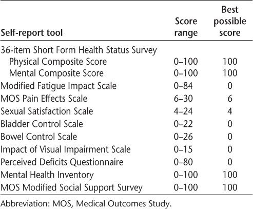 The QOL was measured using the Multiple Sclerosis Quality of Life Inventory,17 a battery of ten scales covering multiple dimensions. The scales and their range of values are listed in Table 2. Walking ability was measured using three outcomes: the 12-item Multiple Sclerosis Walking Scale (MSWS-12), the Timed 25-Foot Walk test (T25FW), and the 6-Minute Walk Test (6MWT). The MSWS-12 is a 12-item questionnaire that measures a person's perception of how MS affects his or her walking ability. The MSWS-12 was developed for use with people with MS and is a valid and reliable measure of walking ability.18 19 The range of values is 0 to 100, with 100 indicating the most negative effect on walking ability. The T25FW measures how many seconds it takes to walk 25 feet (7.62 m) from a standing start with instructions to walk at a fast but safe speed. The T25FW is a widely used, valid, and reliable measure to detect change in walking ability in people with MS.20 The 6MWT is a submaximal test of walking endurance that measures the total distance walked in 6 minutes. In the 6MWT, participants are instructed to walk as quickly, but safely, as possible. The 6MWT has high interrater, intrarater, and test-retest reliability in people with MS.21 22