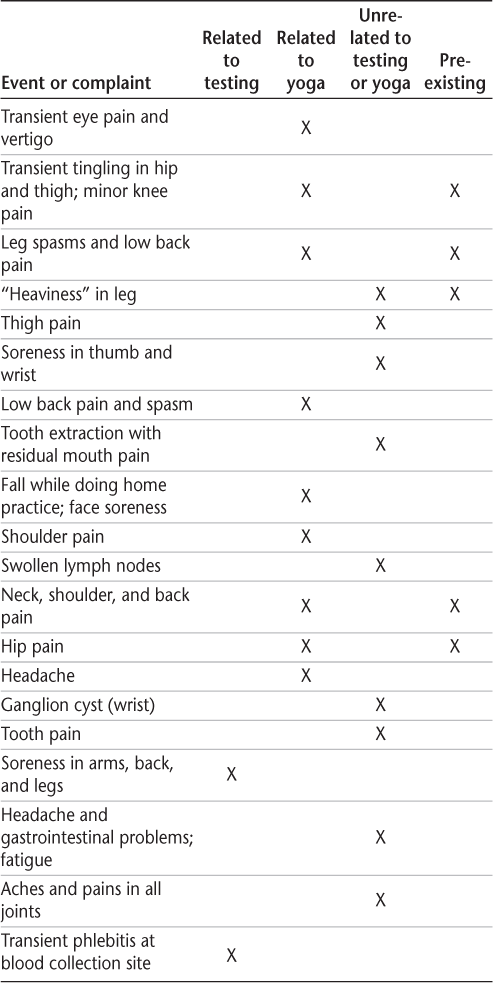 Recruitment, conducted over 2 months and targeted to an area within 30 miles of the study site, yielded an adequate number of participants for this pilot study. Figure 1 summarizes recruitment, screening, enrollment, and study completion. One participant withdrew during the first week of yoga classes because of an unrelated health problem. Fourteen participants (all women) completed the intervention and testing at all three time points. Twenty adverse events were reported during the study, but all were determined to be minor or transient (Table 3). It was common for participants to require individual attention during yoga classes, such as assistance with modifications of postures. Overall, attendance at yoga classes was 89% (mean, 14.2 of 16 classes) for the 14 people who completed the study. The class size ranged from 9 to 14 participants, with a mean class size of 12.5 participants. During the yoga intervention period, home practice (reported by 14 participants) was performed a mean (SD) of 2.4 (1.4) times per week. During follow-up, home practice (reported by 13 participants) was performed a mean (SD) of 2.0 (1.4) times per week.