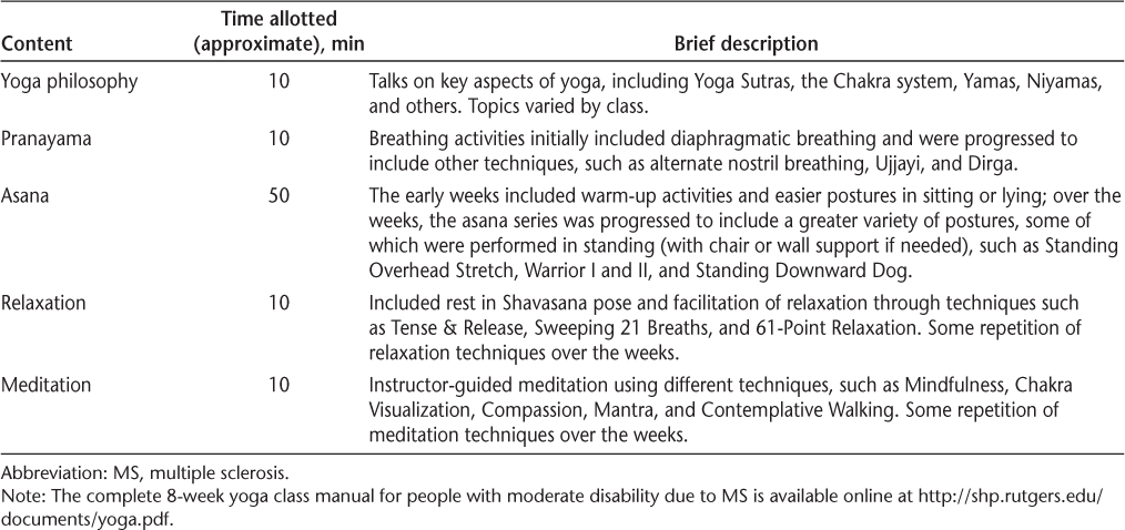Before participant recruitment, the investigators created a manualized yoga program16 using a modified Delphi process (available at http://shp.rutgers.edu/documents/yoga.pdf). The twice-weekly 90-minute yoga sessions included yoga philosophy, breathing practices (pranayama), postures (asanas), meditation, and deep relaxation. In total, 16 classes were provided. All the participants were encouraged to attend all the classes. The class content, summarized in Table 1, was progressed over 8 weeks. Preplanned variations of asanas were implemented to meet the capabilities of participants. Participants were provided with instructions for home practice that was to be performed on the days that class did not meet. Before participant enrollment, certified and experienced yoga instructors underwent 6 hours of training in the yoga protocol by research team members. Each class was staffed by three individuals: two yoga instructors and one study team member (ETC, DK, or SGF). The student to staff ratio at yoga classes was approximately 5:1. Each class segment was led by one yoga instructor. The second yoga instructor and the study team member assisted by providing props (ie, yoga blocks and blankets) and facilitating transfers to and from the floor as needed. Our experience with the classes suggests that this level of supervision is necessary to facilitate performance and ensure participant safety.