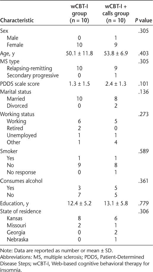 The wCBT-I group consisted of ten women with a mean ± SD age of 50.1 ± 11.8 years. All of them had relapsing-remitting MS (mean ± SD PDDS scale score = 1.3 ± 1.5). The wCBT-I + calls group consisted of nine women and one man with a mean ± SD age of 53.8 ± 6.9 years. Nine of these individuals had relapsing-remitting MS and one had secondary progressive MS (mean ± SD PDDS scale score = 2.4 ± 1.3).