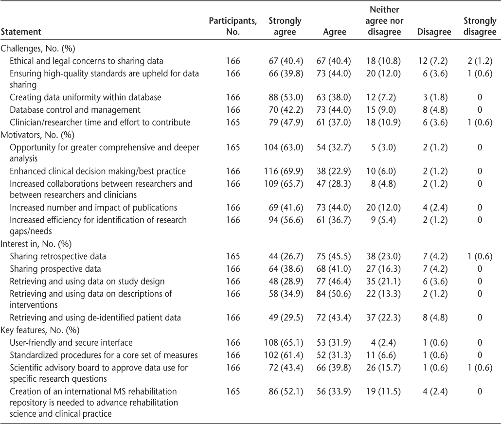 Percentage Agreement. Questionnaire agreement with interest in sharing prospective and retrospective data was 79.5% (132 of 166) and 72.1% (119 of 165), respectively. Median agreement was 75.3% (range, 12.6%) with interest in using data and 92.8% (range, 13.9%) with the three identified key features (a user-friendly and secure interface, a scientific advisory board, and standardized procedures for a core set of measures) (see Table 3 for individual counts and percentages). The 86.0% majority (142 of 165) agreed that creation of the repository was needed to advance MS rehabilitation science and clinical practice; 11.5% neither agreed nor disagreed. Median disagreement was 4.5% (range, 0.6%) with sharing data, 3.6% (range, 3.6%) with use of data, and 0.6% (range, 0.6%) with key features. Median uncertainty or neutral position was 19.7% (range, 6.7%) with sharing data, 21.1% (range, 9.0%) with use of data, and 6.6% (range, 13.3%) with key features.