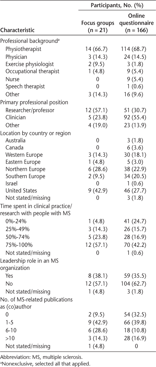 Twenty-one individuals participated in the focus groups, 12 of the 14 invited to the first focus group held in Europe and nine of the 12 invited to the second focus group held in the United States. Most focus group participants self-identified as a researcher or a professor (57.1%) and worked primarily in MS (80.9%) and as a physiotherapist (66.7%).