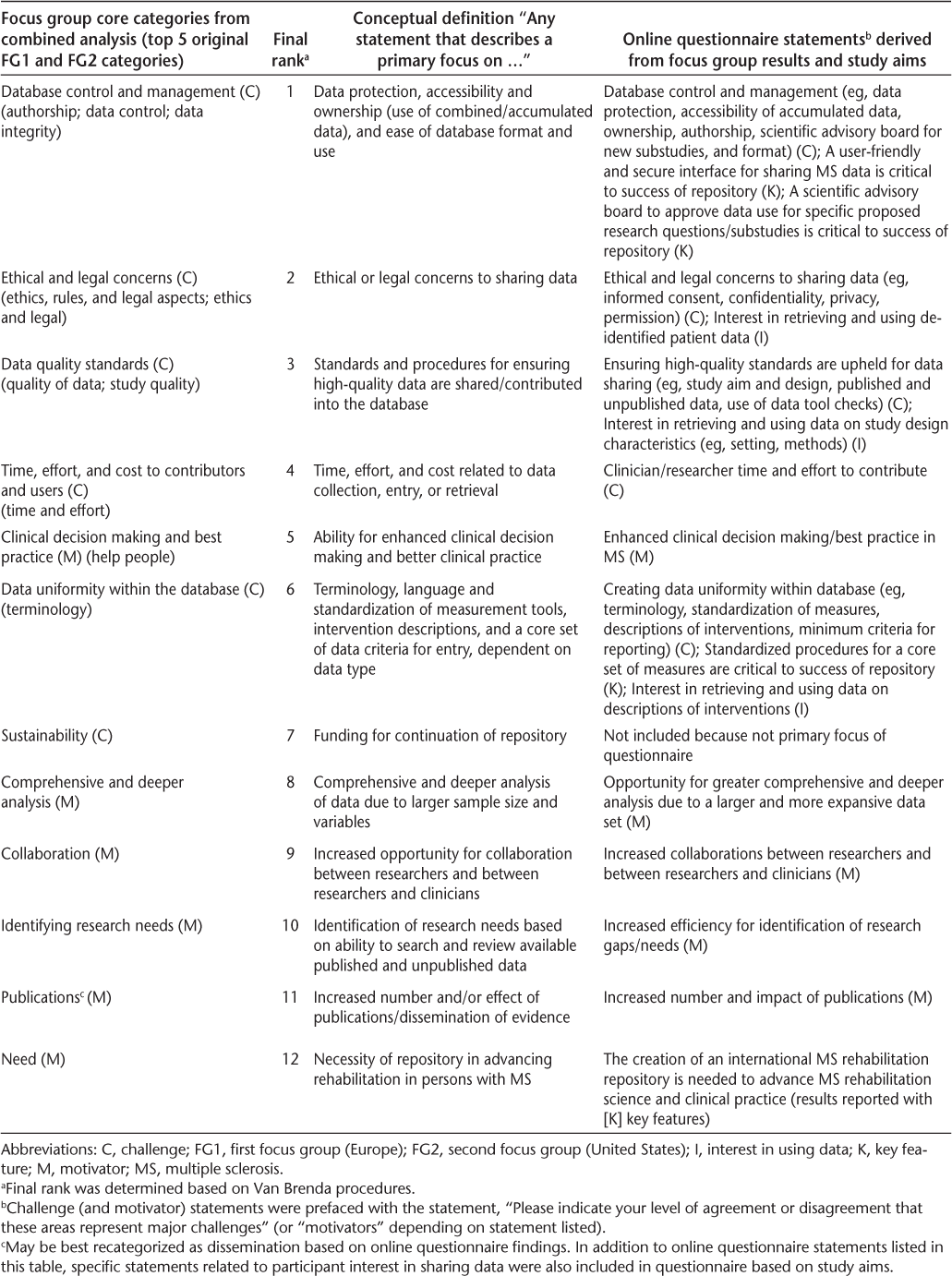 In the focus groups, participants were first asked to independently and separately record on a worksheet their perceived challenges to and motivators for sharing data with an MS rehabilitation data repository. Participants were told it was envisioned that the proposed repository could include both retrospective and prospective data from researchers and clinicians. Further definitions were not given. Next, lists of challenges and motivators were generated through facilitated group discussion.19 Participants then selected and sequentially ranked their top five most important items19 from these lists. They could select items from the categories labeled as challenges, motivators, or both, depending on which they perceived to be the most important. Specific criteria for determining which item was most important were not given. The highest ranked item received the top score of 5; the least important item, the lowest score of 1. Participant votes were then summed, with the highest scored item across participants now receiving a top rank of 1.19