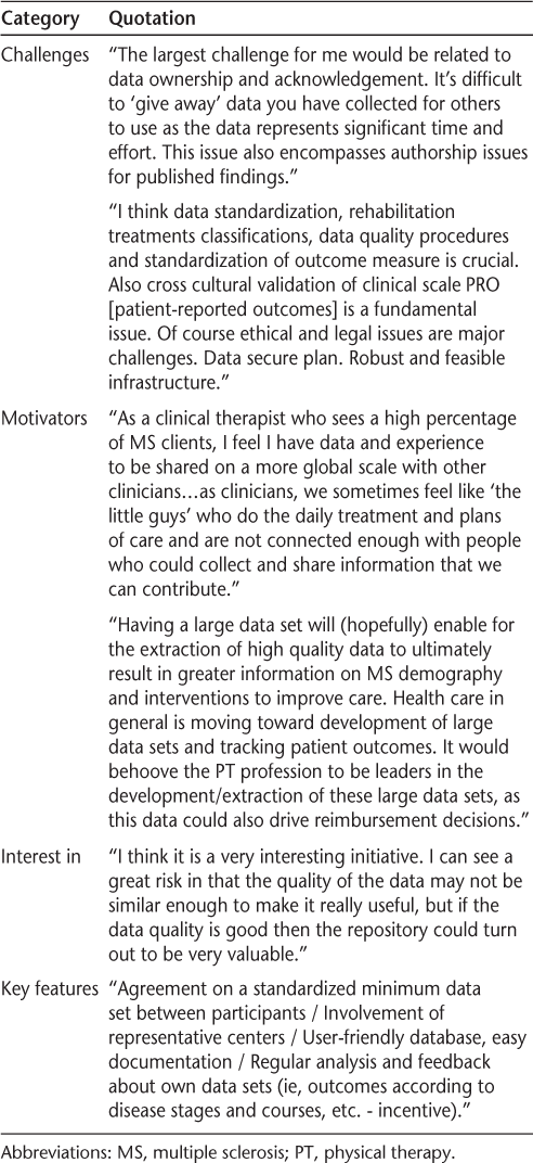 Narrative Data. Content analysis (see Table 4 for selected quotations) revealed strong support for the identified key features. Many responders expressed that large and more comprehensive data sets were needed to move rehabilitation forward in MS. However, interest in participating in the proposed repository was hesitant due to expressed concerns about the feasibility of addressing challenges and the uncertainty of policies and procedures at the time of the questionnaire.