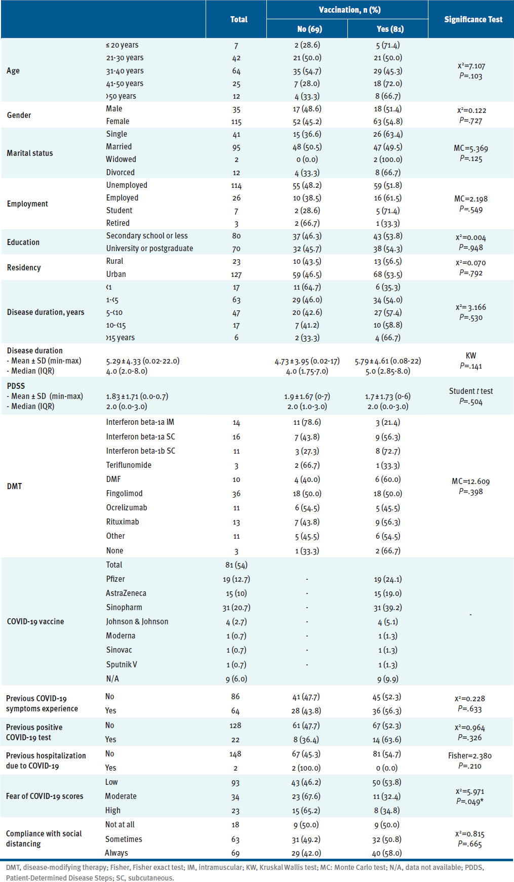 Of 200 patients invited, 150 (75%) responded to the survey during the study period. The median age of the participants was 35.5 years (range, 19-59). Approximately 77% were women; 47% were highly educated (TABLE S1); 84% had relapsing MS (TABLE S2). The median disease duration was 4 years (range, 0.019-22), and the median PDSS was 2 (range, 0-7). Approximately 54% (n = 81) received a COVID-19 vaccination (TABLE 1, TABLE S3). Sinopharm, Pfizer, and AstraZeneca vaccines were the most common brands given to 39.2%, 24.1%, and 19%, respectively (TABLE 1).