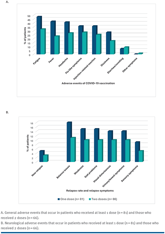 Fatigue was the most common AE, occurring in 48% of participants in general and in 32% after the second dose (FIGURE 1A). Five (≈ 6.2%) people with MS who received the COVID-19 vaccination had a relapse following vaccination. The relapses were confirmed clinically but not radiologically. The details of those who had a relapse are compared with those who did not have a relapse in TABLE S4. Of note, relapse occurrence was higher for patients receiving immunosuppressants than for those receiving immunomodulatory DMTs. (All DMTs used were considered immunosuppressants except interferons.) Relapse symptoms are depicted in FIGURE 1B. Imbalance was the most common neurological symptom reported (18%). This was followed by weakness (15%), gait problems (15%), visual disturbances (14%), urinary or bowel symptoms (14%), and sensory symptoms (9%) (Figure 1B).