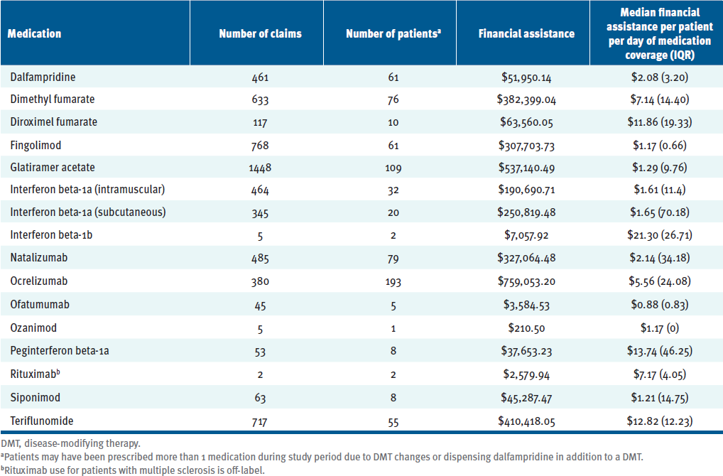 The majority of financial assistance obtained was for patients who received ocrelizumab with a total of $759,053.20, and the median assistance per patient per day of medication coverage was $5.56 (IQR, 24.08), followed by glatiramer acetate (total $537,140.49; median $1.29, IQR, 9.76) and teriflunomide (total $410,418.05; median $12.82, IQR, 12.23). Interferon beta-1b had the highest median assistance per patient per day of $21.30 (IQR, 26.71; TABLE).
