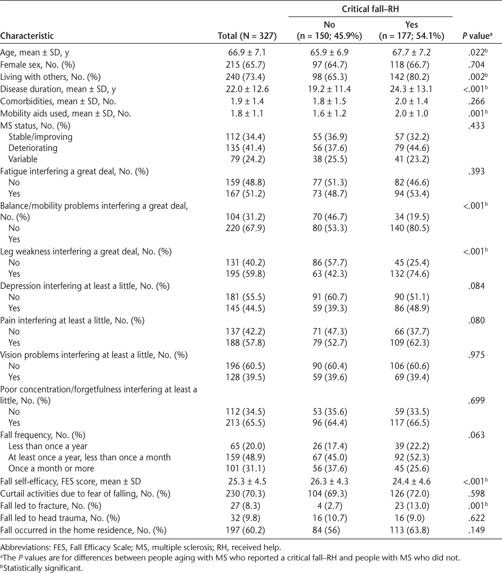 Of the 327 adults with MS aged 55 years and older included in this study, 177 (54.1%) received help to get up after their most recent fall (ie, critical fall–RH). Characteristics of individuals aging with MS who reported a critical fall–RH and those who did not are presented in Table 1. Compared with individuals aging with MS who did not report a critical fall–RH, those who did were slightly older, had MS for 5 years longer on average, and used more mobility aids. A greater proportion of individuals aging with MS who reported a critical fall–RH lived with at least one other person, reported balance or mobility problems, and had leg weakness compared with individuals aging with MS who did not report a critical fall–RH. Fall frequency and activity curtailment were similar between the two groups, but individuals aging with MS who reported a critical fall–RH had lower fall self-efficacy, and a greater proportion of them had a fracture due to their most recent fall, compared with individuals aging with MS who did not report a critical fall–RH.