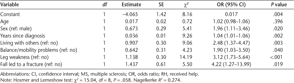 Results from final logistic regression modeling for critical fall–RH in people aging with MS