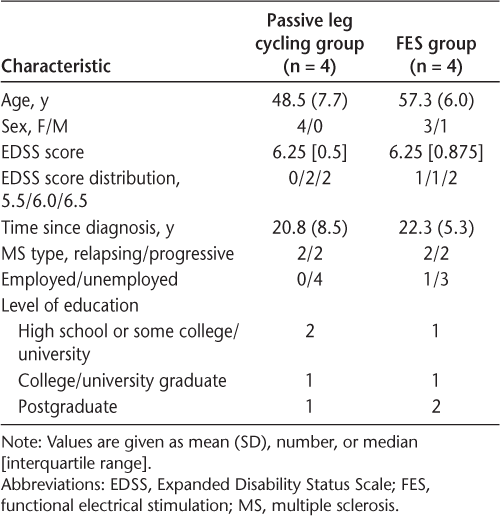 Eleven participants were enrolled in the trial, as previously reported.11 Six participants were randomized to the FES cycling exercise group and five to the passive leg cycling group. Eight participants (four FES and four passive leg cycling) completed the intervention and outcome assessments at follow-up. Participant dropout in both groups (two FES and one passive leg cycling) was attributed to the time commitment involved with the study. Baseline characteristics of participants who completed the study are presented in Table 1. There were no significant differences (all P > .05) between groups at baseline on demographic and clinical variables. There were significant differences between groups at baseline on the physical (P = .01) and psychosocial (P = .04) fatigue subscales such that participants in the FES cycling group reported higher physical and psychosocial fatigue impact compared with those in the passive leg cycling group. There were no group differences on any other cognitive, symptomatic, or HRQOL outcomes.
