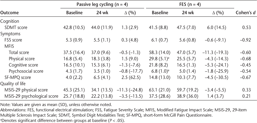 Cognitive, symptomatic, and quality-of-life outcomes at baseline and after 24 weeks of passive leg cycling and FES cycling exercise in people with multiple sclerosis