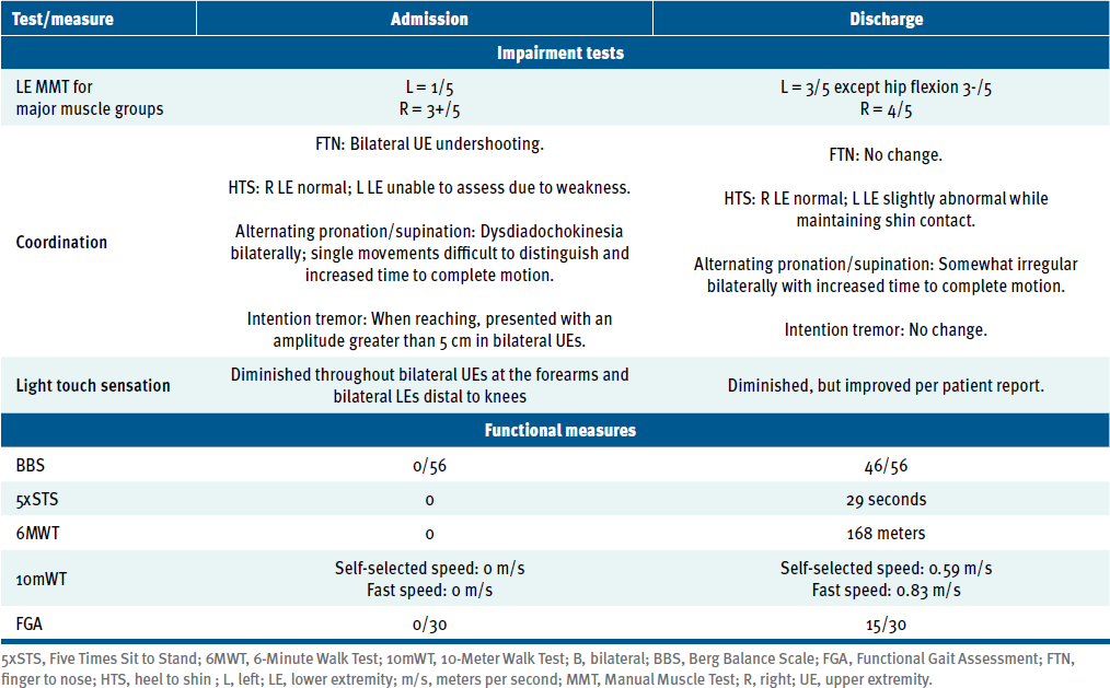 Tests conducted at admission and discharge, as seen in TABLE 1, included the manual muscle test (MMT), coordination tests, and light touch sensation test. Per the Academy of Neurologic Physical Therapy's recommended core set of outcome measures for individuals with neurologic conditions, the following performance-based assessments were used to measure balance, transfers, gait speed and endurance, and dynamic gait, respectively: Berg Balance Scale (BBS), Five Times Sit to Stand (5xSTS), 10-Meter Walk Test, 6-Minute Walk Test (6MWT), and the Functional Gait Assessment (FGA).12 Mobility was also assessed using Centers for Medicare and Medicaid Services Quality Indicators (QI).13