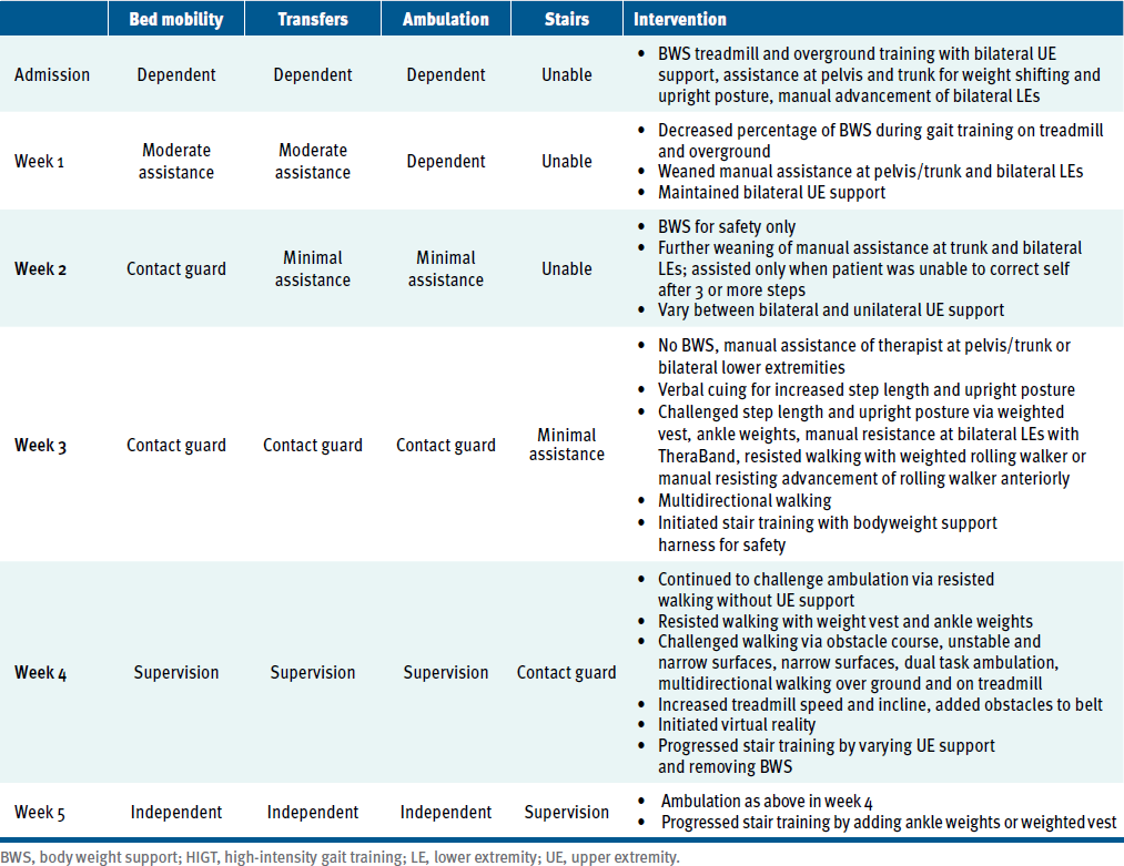 The patient successfully completed a 90-minute training session 4 to 7 times per week for 6 weeks following a HIGT regimen for 40% to 60% of each session. Meaningful gains in bed mobility, transfers, and gait allowed for discharge to his home.