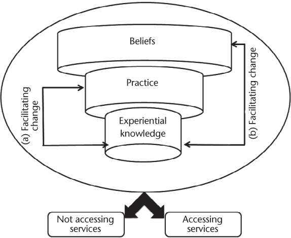 Analysis yielded two key themes: 1) a model of clinical practice development in relation to bladder management and 2) facilitating change to optimize access to services for people with MS. Figure 1 represents the interaction between these themes. Theme 1 is represented by the three cylinders labeled beliefs, practice, and experiential knowledge. The second theme is symbolized by the brackets named facilitating change on both sides of the model. Bracket “a” encompasses the interaction between clinical practice and experiential knowledge of health-care professionals. Bracket “b” incorporates how acknowledgment of individual beliefs can inform clinical practice and experiential knowledge. The arrows stemming from beneath the model indicate that implementing change within the model may influence whether people with MS access services.