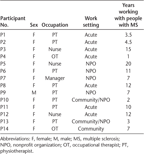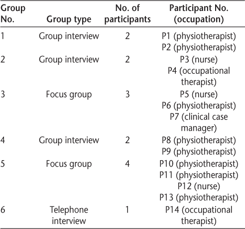 Two focus groups, three dyadic interviews, and one semistructured interview with 14 health-care professionals lasting up to 90 minutes were audio-recorded. Participants included eight physiotherapists, two occupational therapists, three nurses, and one clinical case manager from acute and community settings.