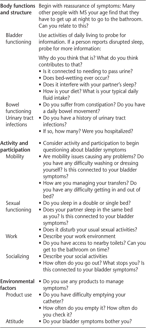 Reflective capacity is an essential characteristic of professional competence and is often prompted by complex clinical problems, which enables learning from experience.23 Participants in this study reflected on their practice, which allowed them to develop strategies to improve service provision for people with MS. They suggested ways in which to optimize discussion of bladder dysfunction during assessment. This involved collecting a detailed history, methods of asking, linking bladder questions to daily activities, probing for more information, and providing a suitable physical environment. Based on the reflections of participants, a set of practical recommendations is offered to address the difficulties clinicians face when subjectively assessing bladder dysfunction (Table 3). These recommendations aim to guide initial assessment and increase communication about bladder dysfunction. To centralize the person with MS, these recommendations are structured according to the International Classification of Functioning, Disability, and Health.24