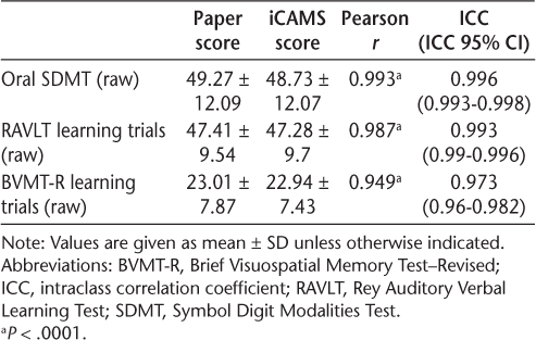 Pearson correlation coefficients (r) revealed strong and significant correlations for all three tests. Excellent agreement was observed between iCAMS and paper versions of the BICAMS tests, with all intraclass correlation coefficients exceeding 0.93. The scores from all the cognitive tests were not statistically significantly different, indicating no proportional bias. Including scoring, administration of the iCAMS application saved approximately 10 minutes over the paper version.