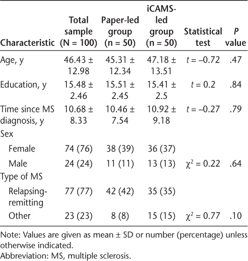Clinical and demographic characterization of the sample was assessed using descriptive and frequency statistics. Consistent with previous MS research, the sample of 100 participants was highly educated (mean ± SD, 15.48 ± 2.46 years), mostly female (74%), with 78% having the relapsing-remitting form of MS. The mean ± SD participant age was 46.43 ± 12.98 years and disease duration (time since diagnosis) was 10.68 ± 8.33 years. There was no statistically significant difference in demographic characteristics between the paper- and tablet-led groups.