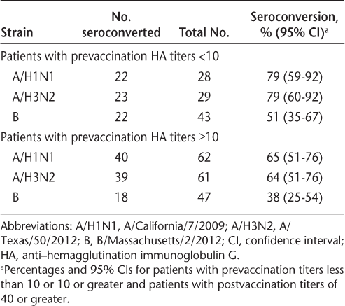 In an additional analysis of seroconversion, patients were grouped by prevaccination titer into those negative at baseline (defined as a prevaccination HA titer <10) and those with a prevaccination HA titer of 10 or higher. Nearly one-third of the patients had prevaccination titers of less than10 for A/H1N1 and A/H3N2, and nearly half of the patients had prevaccination titers of less than10 for B (Table 2). Seroconversion was observed in patients with prevaccination titers of less than 10 and in patients with prevaccination titers of 10 or higher (Table 2).