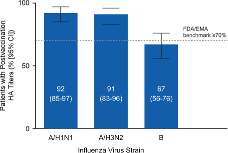 Seroprotection, defined as HA titers of 40 or higher, was detected for most patients for all three strains. Specifically, seroprotection was detected in 92% (95% CI, 85%–97%) of patients for A/H1N1, 91% (95% CI, 83%–96%) for A/H3N2, and 67% (95% CI, 56%–76%) for B (Figure 1).