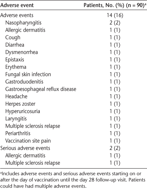During the 28-day substudy, AEs were reported by 14 patients (16%) (Table 3). Vaccination site pain was reported as an AE by one patient. The only AE that occurred in more than one patient in any Medical Dictionary for Regulatory Affairs Preferred Term was nasopharyngitis in two patients (2%). MS relapse and allergic dermatitis were each reported by one patient as SAEs.