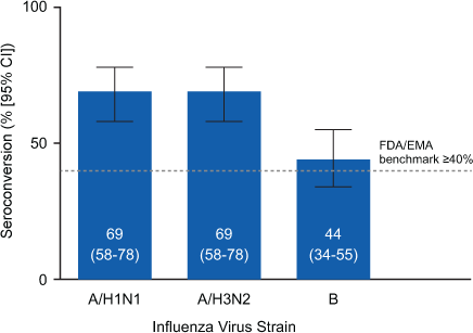 Seroconversion, defined as a change from negative (HA titer <10) to seroprotected after vaccination or at least a fourfold increase in titer if the titer was 10 or higher at baseline, was detected for all three strains. Seroconversion was observed in 69% (95% CI, 58%–78%) of patients for A/H1N1, 69% (95% CI, 58%–78%) for A/H3N2, and 44% (95% CI, 34%–55%) for B (Figure 2). The observed rates of seroconversion were higher than the seroconversion benchmark of 40% or more for all three strains, as defined by the European Medicines Agency (EMA) and the US Food and Drug Administration (FDA).
