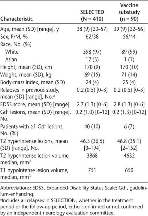 To be included in the substudy, SELECTED patients must have provided informed consent for the 2013–2014 influenza vaccine substudy and completed at least 3 months of uninterrupted daclizumab beta treatment before entering the substudy. Key exclusion criteria for the substudy included severe allergic reaction to any component of the trivalent seasonal influenza vaccine (including eggs and egg proteins), known latex allergy, previous vaccination with 2013–2014 influenza season strain, respiratory illness in the 2 weeks preceding planned vaccination, any ongoing AE or laboratory abnormality in SELECTED that resulted in suspension of daclizumab beta treatment at the time of enrollment in the substudy, any vaccination in the previous 4 weeks, and receiving any of the following in the previous 3 months: blood products, oral or intravenous corticosteroids, or intravenous immunoglobulins. The key inclusion and exclusion criteria for SELECTED and eligibility criteria for SELECT and SELECTION have been reported previously.1,2,11