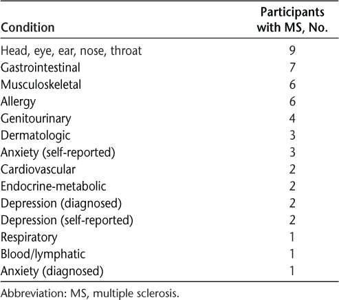 Current medical or psychological conditions reported by the 15 participants with MS