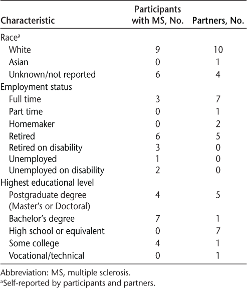 Participants with MS included 13 women and two men aged 38 to 73 (mean, 60.2) years. Fourteen participants were diagnosed as having relapsing-remitting MS and one as having secondary progressive MS. Time since diagnosis ranged from 6 to 37 (mean, 19.4) years. Partners included three women and 12 men aged 44 to 73 (mean, 62.0) years. The time the couples reported being together ranged from 8 to 50 (mean, 27.6) years. One couple was a same-sex couple. Table 1 provides further demographic details. Partners reported no mental health conditions or physical disabilities. Participants with MS reported additional medical conditions as listed in Table 2. All participants with MS were able to walk without assistance, and four participants reported using a cane sometimes.