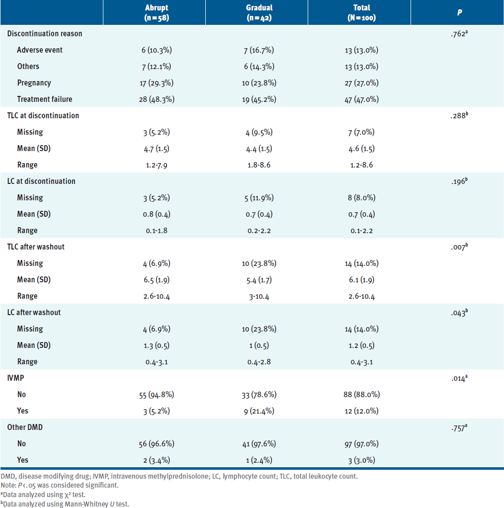 Patients receiving fingolimod were divided into 2 study groups: abrupt cessation and gradual tapering. Abrupt cessation was used in nonoptimal situations such as unplanned pregnancy, the emergence of AEs related to fingolimod use, or other patient-related factors; gradual tapering was used in cases of family planning or as a response to the drug's failure for that particular person. There were 2 strategies for gradual tapering. In the Egyptian centers, patients were placed on every other day dosing for 2 weeks, then 3 times weekly for 2 weeks, then twice weekly for 2 weeks. In Kuwait, patients had every other day dosing over 1 month. The washout for switching DMDs was scheduled to last 6 weeks, but varied due to factors such as delayed conception, logistic causes, or persistence of lymphopenia for long periods.