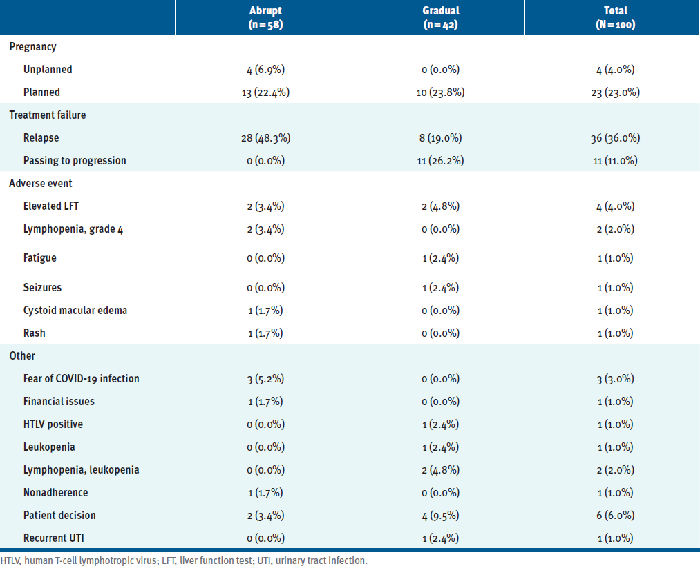 Treatment-response failure was the primary cause of drug discontinuation in the abrupt cessation group (48.3%) and the gradual tapering group (45.2%); other causes included pregnancy, drug-related AEs, and other reasons (TABLE S3). Causes of fingolimod discontinuation are detailed in TABLE S4